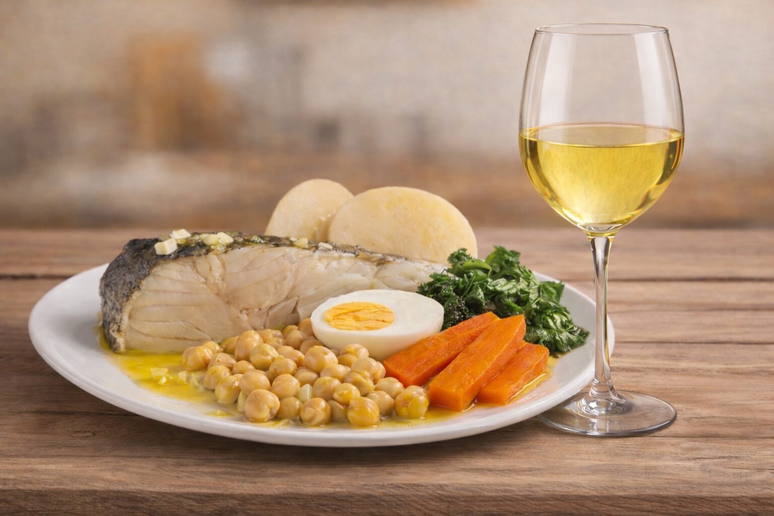 O bacalhau cozido com couves, batata, grão e ovos é um prato de salinidade elevada, textura firme e presença marcante de azeite.