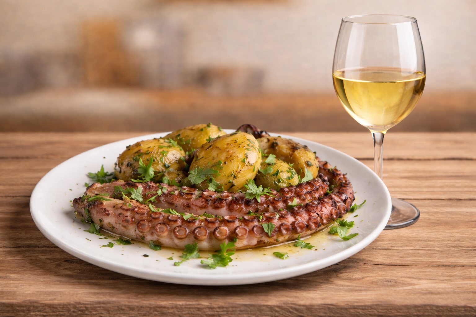 O polvo, cozido ou assado, combina doçura natural, textura firme e gordura do azeite.