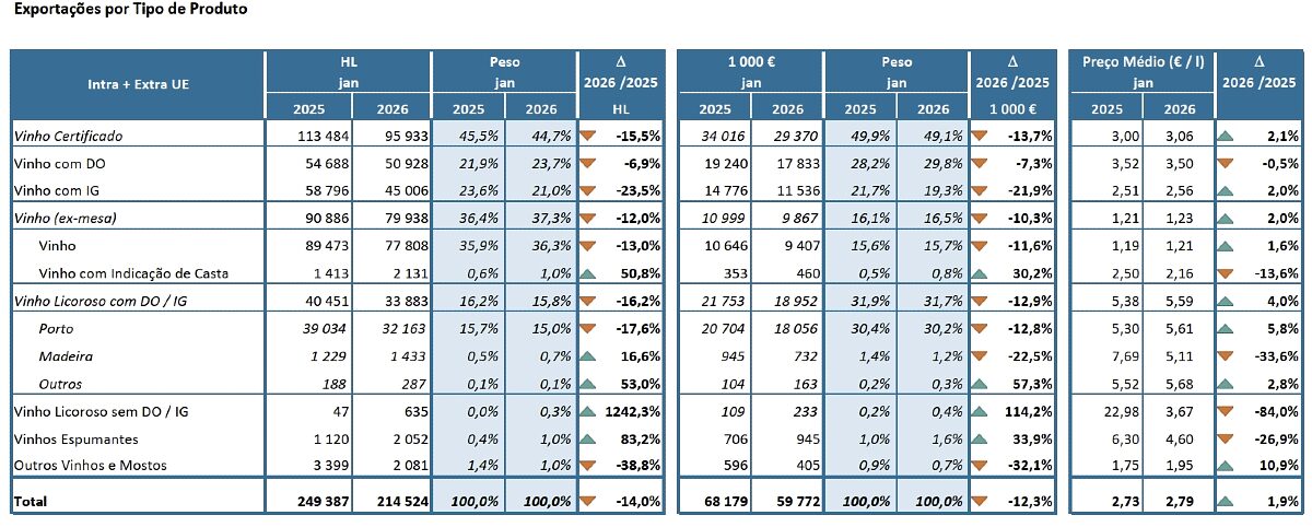 Entre janeiro de 2025 e janeiro de 2026, o volume exportado diminuiu 14%, enquanto o valor total caiu 12,3%. Em sentido contrário, o preço médio por litro subiu ligeiramente, fixando-se nos 2,79 euros, mais 1,9% do que no período homólogo.