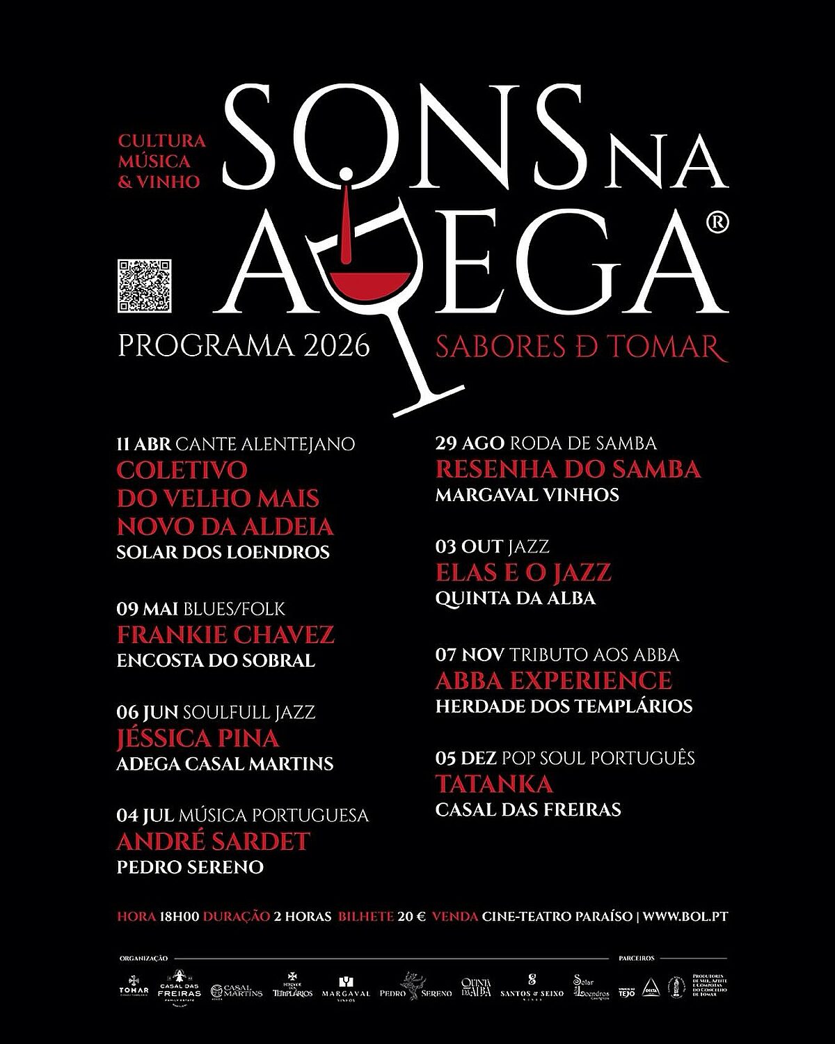 O ciclo evontos “Sons na Adega” volta a Tomar em 2026 com um formato já afinado: concertos em adegas e propriedades vínicas, ao fim da tarde, com tempo para ouvir e provar com calma.