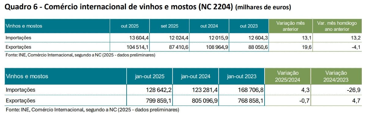 Por outro lado, as importações subiram 4,3%, com um acréscimo de 5,4 milhões de euros, totalizando 128,6 milhões de euros no acumulado de 2025. Este crescimento, embora modesto, reflete uma crescente procura interna por vinhos estrangeiros.